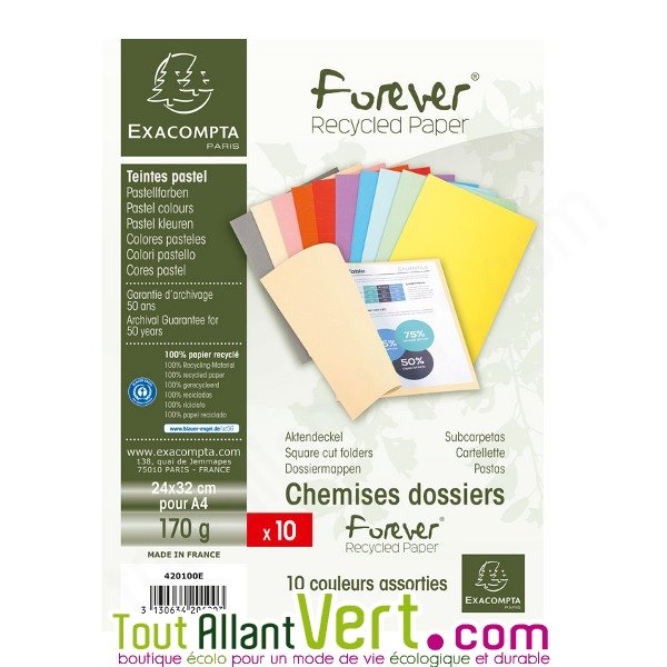 10 chemises papier 100% recyclé aux couleurs pastel. Idéal pour un classement ordonné et pour retrouver vite ses documents ! 24X32cm. labelisées Ange-Bleu. Marque: Exacompta. Fabriqué en France.