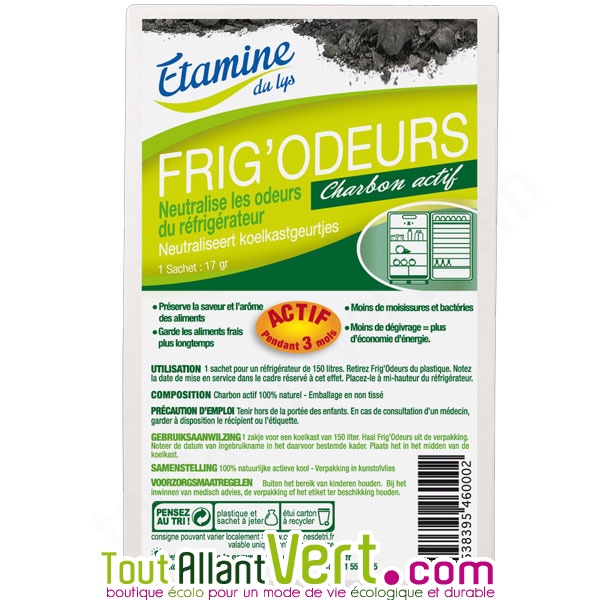 Absorbeur d'odeurs réfrigérateur sans parfum Etamine du Lys.Cet absorbeur d'odeurs est prêt à l'emploi. Il neutralise les odeurs. Il suffit d'ôter de le placer dans le frigo, il agit tout seul pendant 3 mois !