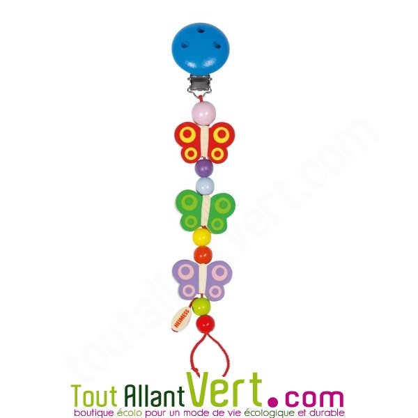 Cet accroche-tétines est en bois, composé de 3 papillons colorés, 7 perles rondes et un clip en acier inoxydable sans nickel.La tétine de votre enfant s'accroche à la ficelle au bout et l'attache-clip permet de l'accrocher facilement à ses vêtements. Fini les tétines qui tombent à terre ou s'égarent sans cesse !