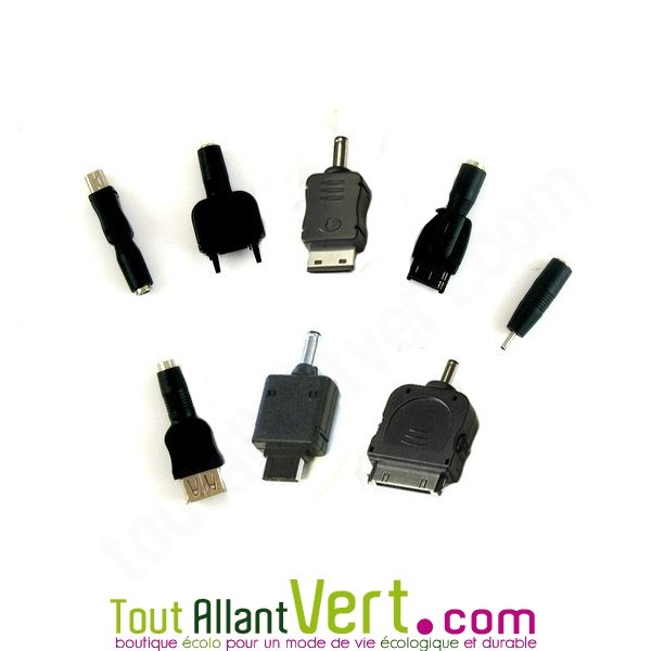 8 adaptateurs pour chargeur de téléphone et USB.Vous pouvez utiliser ces adaptateurs pour les chargeurs solaires présents sur notre site.