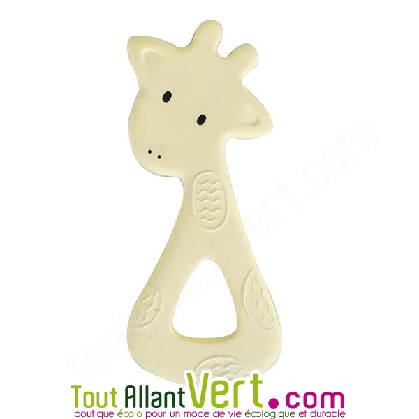 Anneau de dentition bébé sans bisphénol A, ni phtalates, ni PVC. En forme de girafe jaune 100% caoutchouc naturel, fabriqué par une entreprise éthiquement responsable. 6.5cm x 14cm de hauteur.