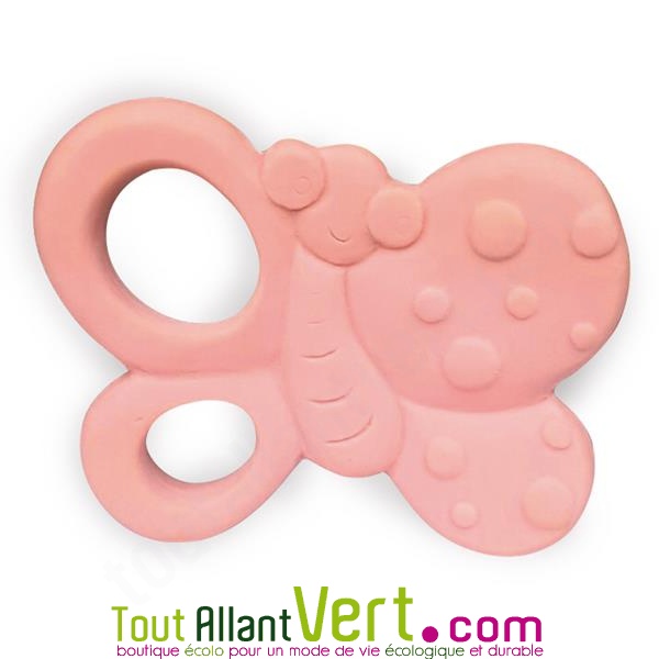 Anneau de dentition sans bisphénol A, ni phtalates, ni PVC. En forme de papillon rose 100% caoutchouc naturel, fabriqué par une entreprise éthiquement responsable. 8cm x 10.5cm.