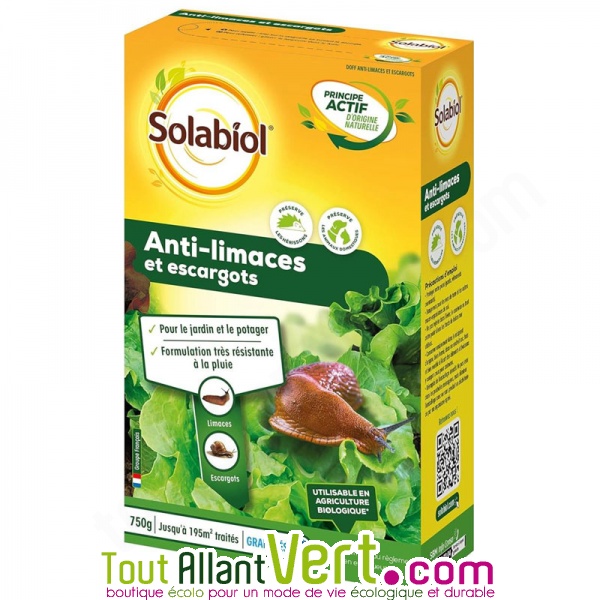 de SolabiolAnti-limaces et escargots prêt à l'emploi et 100% d'origine naturelle. C'est un appât en granulés agissant par ingestion. Facile à épandre. Action rapide: jusqu'à 4 fois plus de limaces mortes après 3 jours. Résiste à la pluie. Préserve les animaux domestiques et hérissons. 750g. Jusqu'à 195m² traité. Utilisable en agriculture biologique. Fabriqué en France par Solabiol.