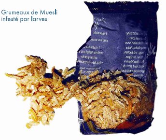 On les trouve en général dans la farine, les céréales, les noix, les épices, les fruits secs, les pâtes et même le chocolat. Le premier dommage est la diminution des réserves alimentaires, directement consommés par ces nuisibles. Mais le pire est qu'une partie encore plus importante devient non comestible car elle est souillée par les crottes des larves et les restes de cocon qui favorisent le développement d'acariens et de champignons. Tout cela est plus que gênant.