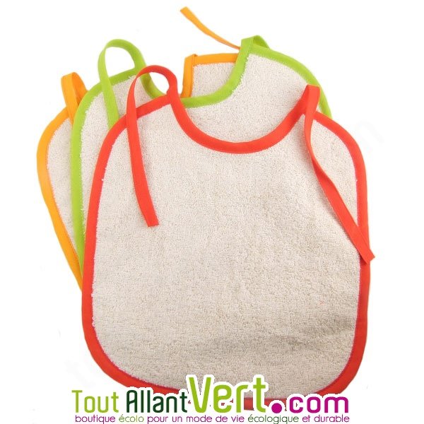 Bavoir en éponge coton bio, lot de 3 assortis, 32 x 28 cm.- 3 couleurs : Eponge écrue et tour orange, vert et rouge