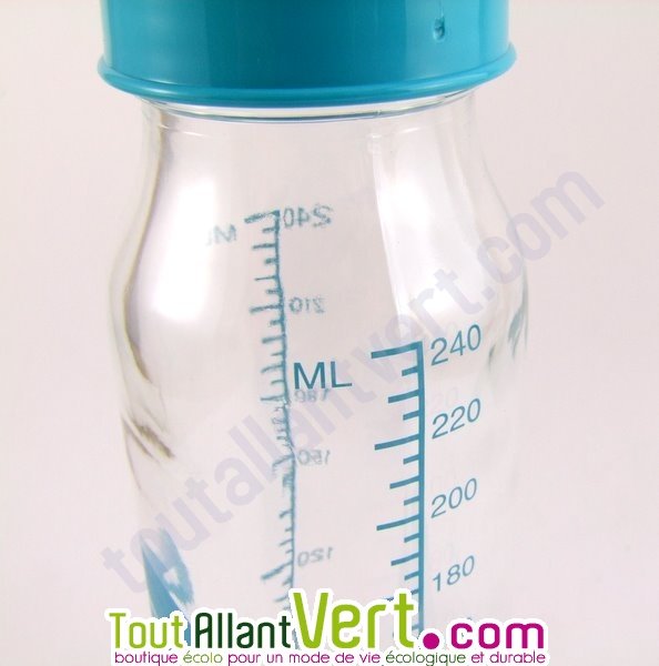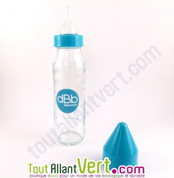 Biberon en verre 110 ml sans bisphénol A, bouchon bleuEntièrement fabriqué en France, ce biberon est simple, coloré et de bonne qualité. En verre épais, il est équipé d'une tétine en silicone de qualité médicale (naturellement sans bisphénol) et spécialement étudiés pour les tout petits.