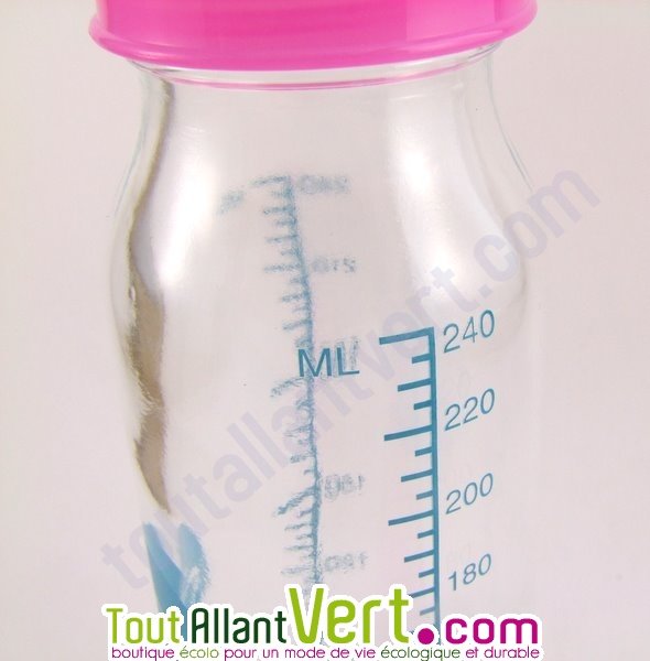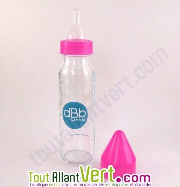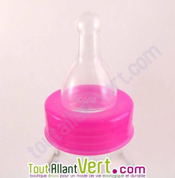 Biberon en verre 110ml jus de fruit, bouchon roseEntièrement fabriqué en France, ce biberon est simple, coloré et de bonne qualité. En verre épais, il est équipé d'une tétine en silicone de qualité médicale (naturellement sans bisphénol) et spécialement étudiés pour les tout petits.