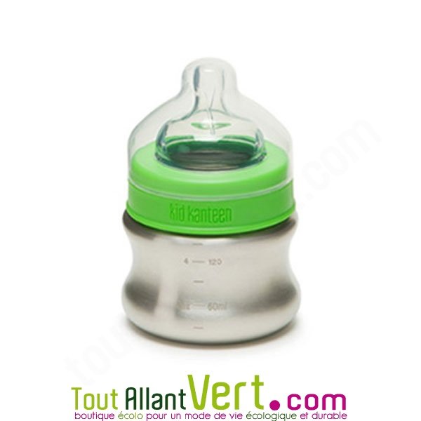 Biberon en acier inoxydable avec un tétine en silicone de qualité médicale. Capacité 148ml pour bébés 0 à 6 mois. Graduée à l'extérieur, visible à l'intérieur. Marque Klean Kanteen.