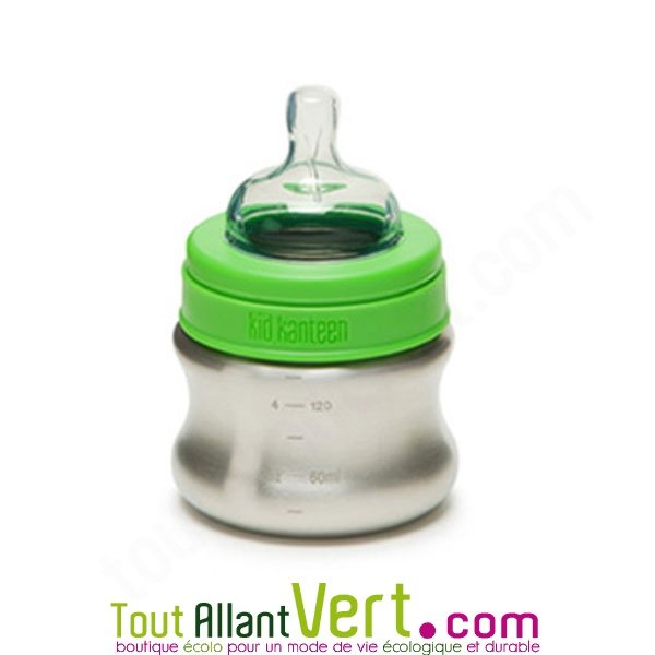 Biberon en acier inoxydable avec un tétine en silicone de qualité médicale. Existe en 148 ml et 250ml. Graduée à l'extérieur, visible à l'intérieur. Marque Klean Kanteen.