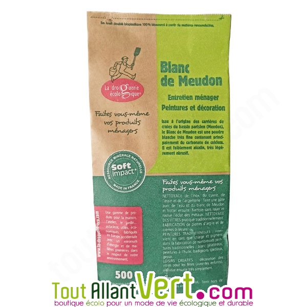 Issu à l'origine des carrières de craies du bassin parisien (Meudon), le Blanc de Meudon est une poudre blanche très fine contenant principalement du carbonate de calcium. Il est faiblement alcalin, très légèrement abrasif et est traditionnellement utilisé pour la fabrication de peintures et les travaux ménagers. Il est non toxique et sans danger pour l'environnement.