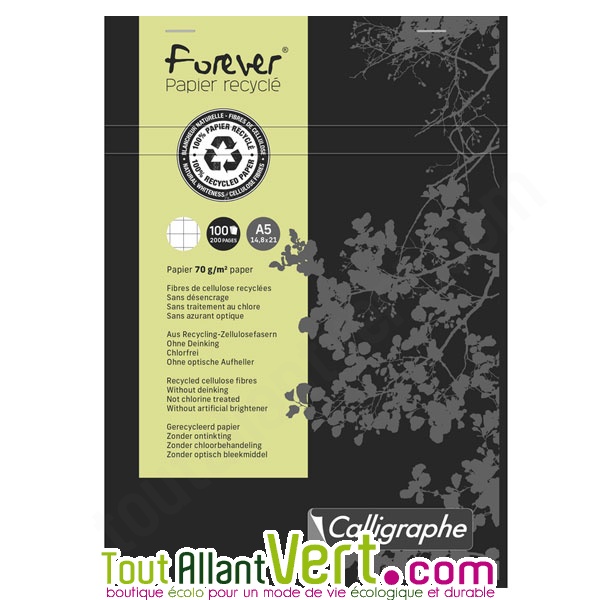 Bloc recyclé petits carreaux A5 200p Noir Forever.Dotée d'une jolie couverture colorée aux motifs nature, cette gamme de bloc 100% recyclé saura convenir à tous les besoins que ce soit au bureau, à l'école ou à la maison.