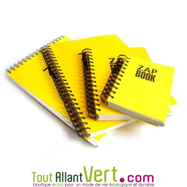 La collection ZapBook vous permet d'avoir des blocs de toutes les couleurs et de toutes les tailles. Les ZapBook sont disponibles au format A4 (21x29.7cm), approx. A5 (14.8x21cm), approx. A6 (11x15cm) en coloris bleu, jaune, vert, rouge, en bloc uni encollé sans spirales, avec spirales à la française ou spirales à l'italienne. Ses usages sont multiples.