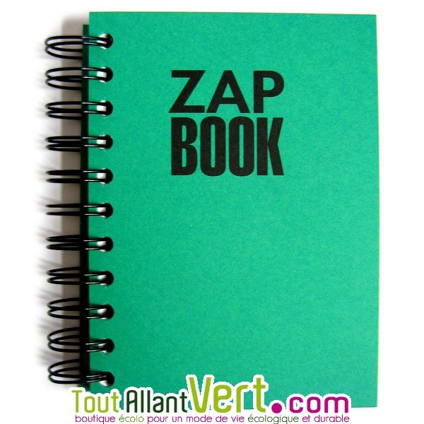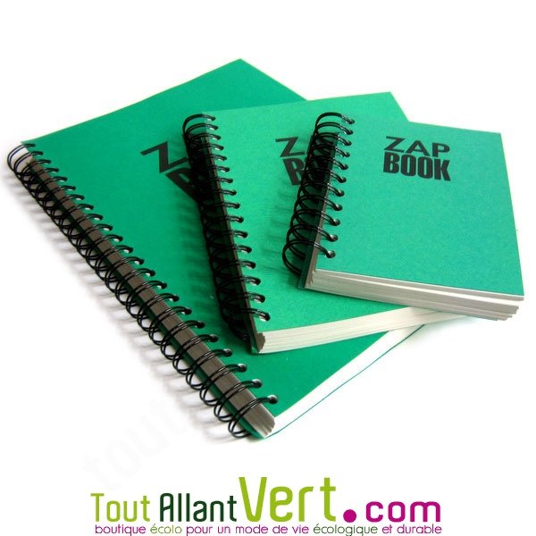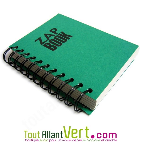 100% recyclé et certifié. Bloc épais à spirale façon cahier :380 pages blanches de 11x15cm. Fabriqué en France. Marque Zap Book. Couverture cartonnée de coloris Verte.