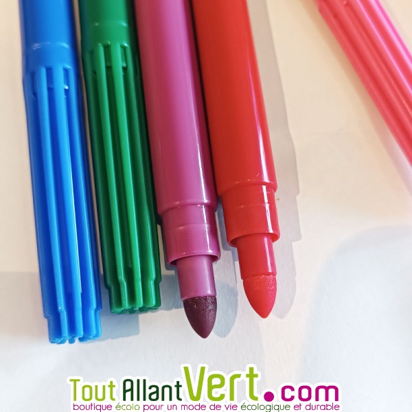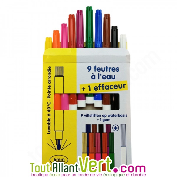 Feutres écologiques à l'eau avec effaceur.- 9 couleurs, non toxiques et lavables