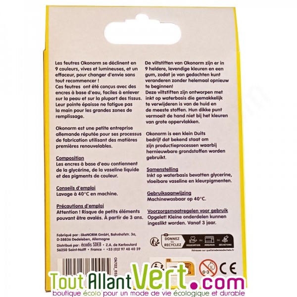 ★ ★ ★ ★ ★12 avis clients9 feutres de couleur + 1 effaceur pour effacer les couleurs. Feutre à l'eau lavable sur presque tous les tissus. Pointe épaisse de 6 mm, très solide, elle ne s'enfonce pas, même en cas de fortre pression. Durable et écologique, ces feutres sont non toxiques et ne sèche pas facilement. Fabriqués en Allemagne.