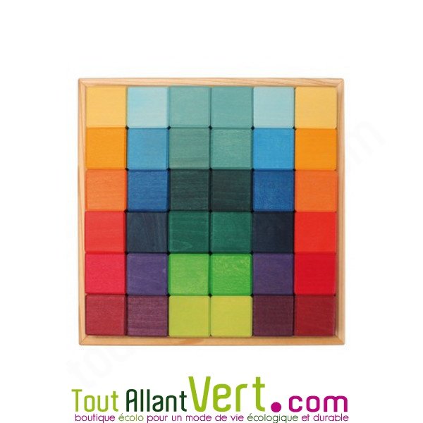 Boîte de 36 pièces en bois arc-en-ciel 18 couleurs dégradées.Un excellent outil pour développer sa créativité et apprendre les couleurs! Cette boîte de 36 cubes colorés de 18 nuances différentes peut être utilisée comme jeu de construction, jeu d'association de couleurs, de création de paysage... Les possiblités sont multiples! Le tout dans un environnement de jeu qui sensibilisera à la couleur et les différentes tonalités. A partir de 3 ans.