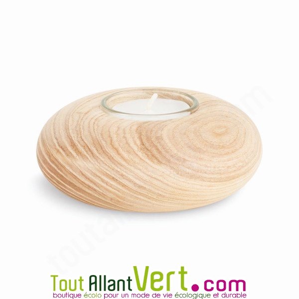 Bougeoir de table en bois naturel, forme galet rond, diamètre 10,5cm- Bois de frêne non traité