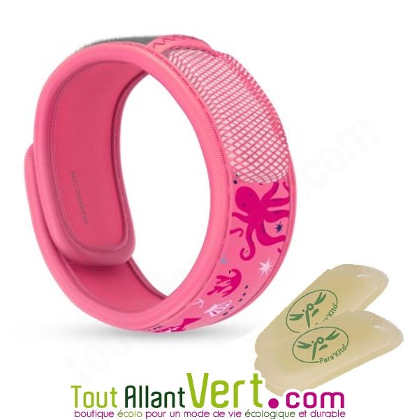 Para’Kito - Bracelet anti-moustiques aux huiles essentielles, rose avec motif pieuvre.- 2 Recharges inclues pour une durée moyenne d'efficacité de 2 x 15 jours = 30 jours