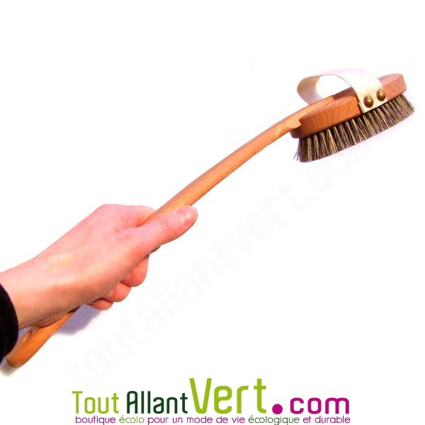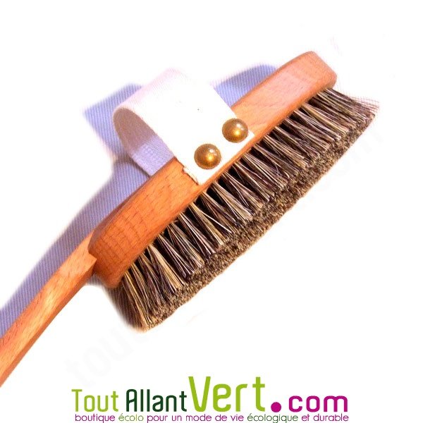 La brosse peut s'utiliser seule ou avec son manche : Elle se tient bien en main grâce à sa sangle en coton sur le dessus de la brosse. Elle s'accroche sur le manche pour les parties difficiles à atteindre.