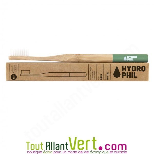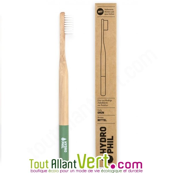 Brosse à dents en bambou, poils nylon medium, vert, Hydrophil.- Le bambou est un agent antibactérien naturel