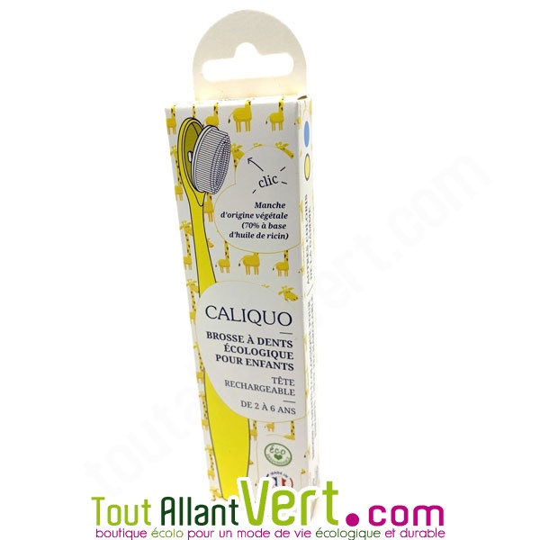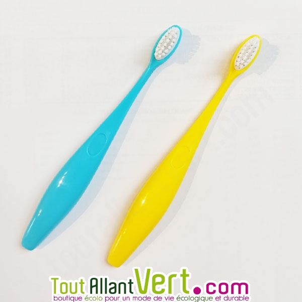 Une brosse à dent bien conçue : tête changeable, manche Bleu à 70% d'origine végétale, poils nylon arrondis et fabriquée en France. Economique, écologique ! Poil souple. Marque Caliquo.