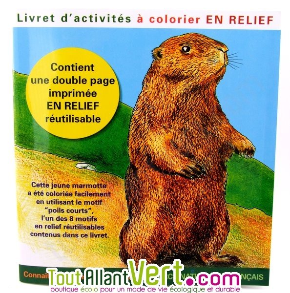 Cahier à colorier en relief, les animaux des parcs nationaux français, en papier recycléPour colorier en relief ! Grâce à la double page de motifs en relief, vous pourrez reproduire en coloriant les poils longs ou courts, les plumes, l'eau, les herbes, la forêt, les rochers, les écailles, le duvet... Ces motifs sont imprimés en relief sur la double page centrale pour pourvoir facilement les détacher. Ils suffit de les glisser sous la feuille à colorier, de passer régulièrement avec des crayons de couleurs ou des pastels et l'on obtient des dessins aussi vrais que nature ! Ces motifs sont réutilisables pour des centaines d'autres coloriages !