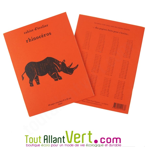 Cahier écolier recyclé A5, 48 p Rhinocéros.Ce cahier est astucieux avec sa table de multiplication au dos, même s'il faut quand même l'apprendre ! La couverture de ce cahier recyclé représente un rhinocéros.