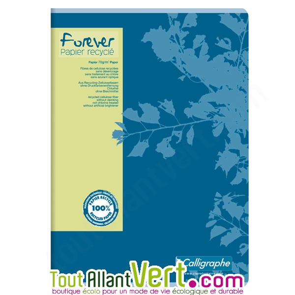 de Forever★ ★ ★ ★ ★4 avis clientsCahier recyclé 21x29,7cm petits carreaux, 96p, couverture bleue. Ce cahier 100% recyclé a une blancheur naturelle : sans désencrage, sans chlore et sans azurant optique. Doté d'une jolie couverture colorée aux motifs nature, ce cahier saura convenir à tous les besoins que ce soit au bureau, à l'école ou à la maison. ...Ce produit ne fait plus partie de notre catalogueCet article n'est plus disponible à la vente chez nous.Découvrez d'autres produits