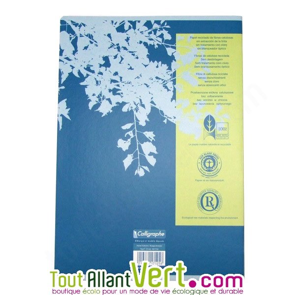 Cahier recyclé 21x29,7cm petits carreaux, 96p, couverture bleue.Ce cahier 100% recyclé a une blancheur naturelle : sans désencrage, sans chlore et sans azurant optique.