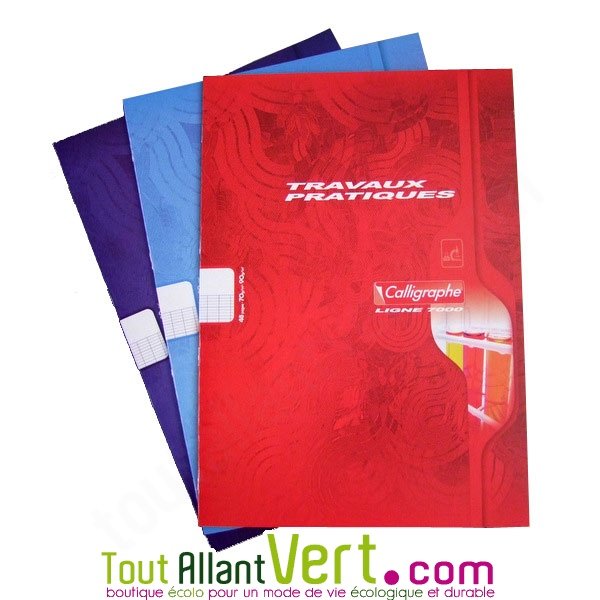 Cahiers de Travaux Pratiques, couverture cartonnée bleu foncé.Ce grand cahier de TP alterne une page grands carreaux pour écrire et une page unie blanche pour les exercices pratiques. La couverture en carton est rigide pour assurer une bonne tenue du cahier tout au long de l'année. Papier certifié issus de forêts gérées durablement.