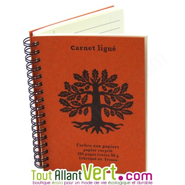 Petit carnet à spirale, ligné, 120 pages recyclées.Les pages sont de couleur ivoire, lignées avec une marge verte. La couverture orange est en carton épais pour plus de rigidité.