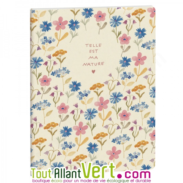 La couverture cartonnée a un joli motif floral printannier. Pages recyclées couleur blanches avec des pointillées (ni ligne, ni carreaux) pour de jolis mots ou notes. Slogan sur le dessus du carnet d'écriture : Telle est ma nature