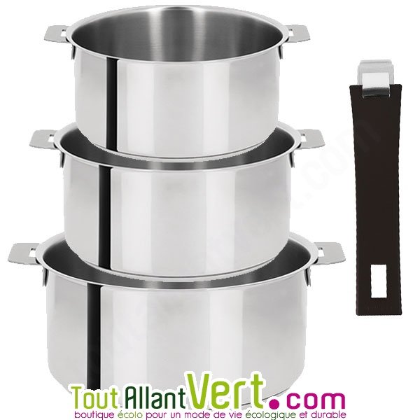 - Lot de 3 casseroles (16cm, 18cm, 20cm) + poignée amovible en bakélite noire offerte dans ce lot !