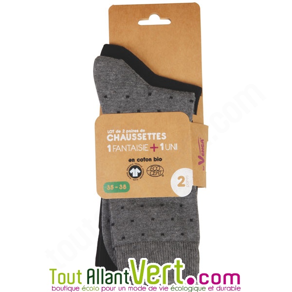 Prix de Chaussettes Femme Coton Bio, lot de 2 paires uni noir / pois gris : 11.95€