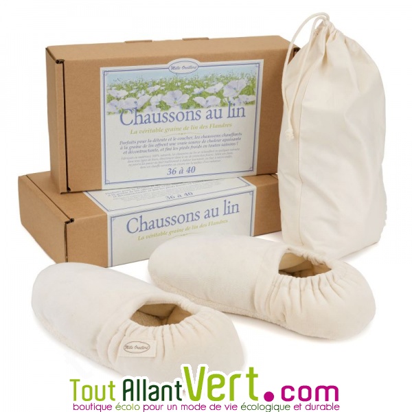 Agréables chaussons chauffants garnis de lin cultivé en France, pour un instant paisible qui apporte décontraction et calme après une dure journée.