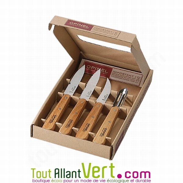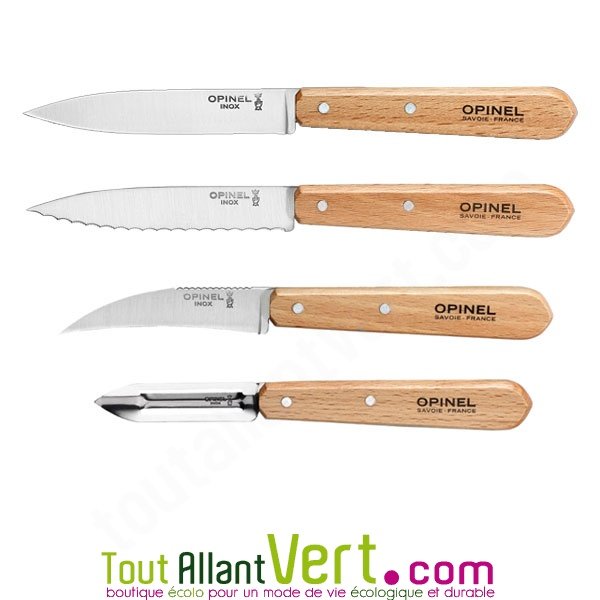 de OpinelUn beau coffret des 4 couteaux de cuisine les plus utilisés en cuisine. Des lames en inox de haute qualité. Marque Opinel et fabrication française. Passe au lave-vaisselle. 4 couteaux : couteau d'office, couteau cranté, couteau à légumes et épelucheur à légumes.