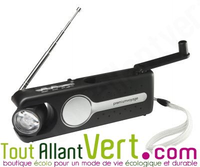 Combiné multifonctions à dynamo radio-torche-alarme-chargeur téléphone portableEconomique et écologique, ce combiné mulifonctions ne nécessite aucune pile, car il se recharge manuellement grâce à sa dynamo intégrée. Compagnon indispensable de toutes vos escapades, ce kit comprend une lampe torche puissante avec une tête orientable à 180°, un émetteur de signaux, une alarme, une radio FM et un chargeur de téléphone portable.