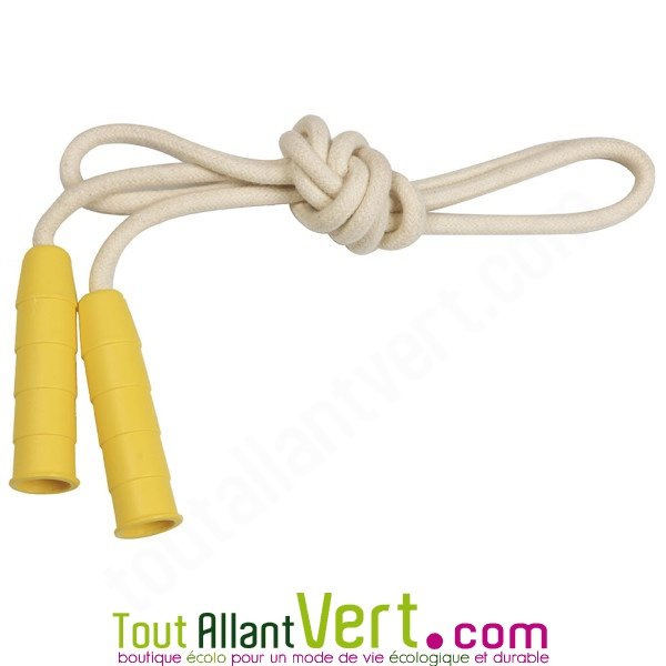 Corde à sauter écologique pour les enfants à partir de 3 ans. Fabriquée en bioplastique avec pigments naturels et corde en coton labellisé Oeko-tex 100. Poignées jaunes. Longueur 195cm (corde) et 10 cm (poignées). Fabriqué en France.