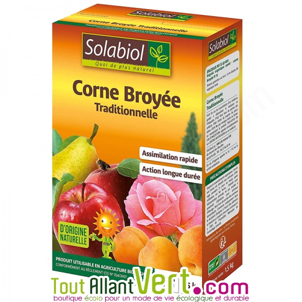 Corne Broyée 1,5kg, Solabiol.La corne torréfiée est un engrais de fond par excellence. Elle stimule la croissance des végétaux et la couleur des feuillages. Son action est progressive et durable. Elle est riche en azote organique qui se minéralise très progressivement tout au long de la culture (beaucoup plus lentement que le sang séché). Cet engrais est recommandé pour les repiquages et les plantations.