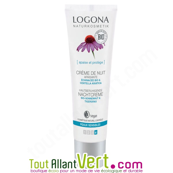 de LogonaCrème de nuit apaisante à l'échinacée bio et centella asiatica pour les peaux sensibles qui stimule la régénération de la peau, apaise et protège. Ph neutre. Fabriqué en Allemagne