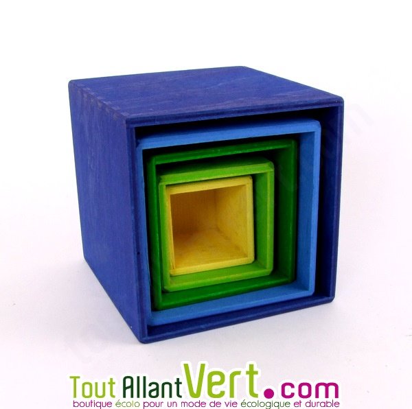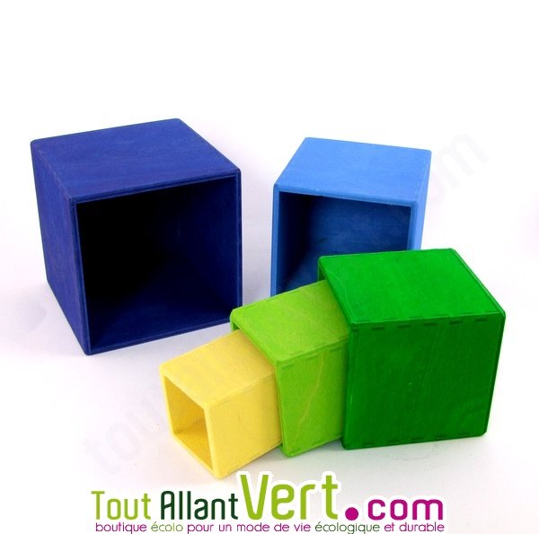 Ce jouet simple invite les petits à inventer des histoires, à découvrir, à comprendre quel cube s'encastre dans quel cube ou se place au dessus de quel autre cube.