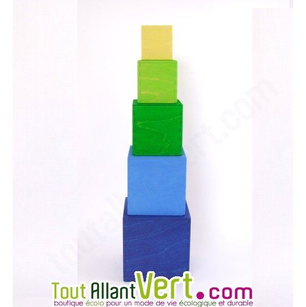 La tour est composée de 5 cubes colorés : 10cm, 8cm, 6,2cm, 5cm et 3;5 cm environ