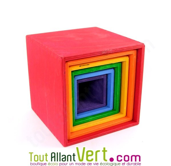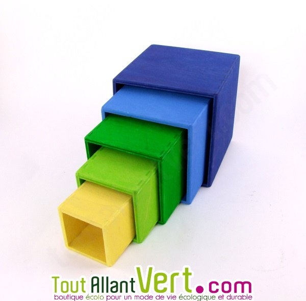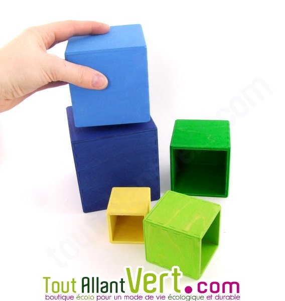 Ce jouet simple invite les petits à inventer des histoires, à découvrir, à comprendre quel cube s'encastre dans quel cube ou se place au dessus de quel autre cube.