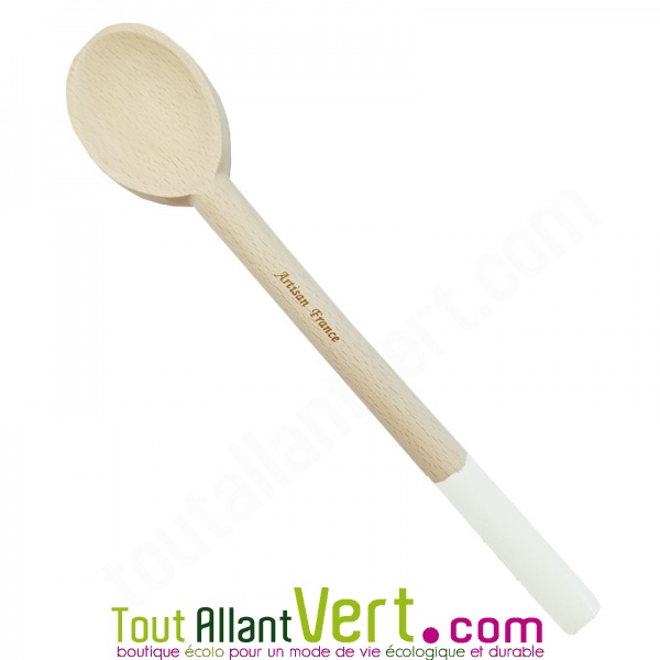 Cuillère en bois de hêtre, 30 cmCette cuillère en bois sera votre allier pour vos poêles fragiles. Son bout coloré Blanc apporte de la couleur à votre cuisine ! Cette cuillère présente de nombreux avantages écologiques. En bois de hêtre non traité, la finition à la cire d'abeille est très soignée et saine. Large, elle permet de retourner facilement vos viandes, poissons et autres légumes.
