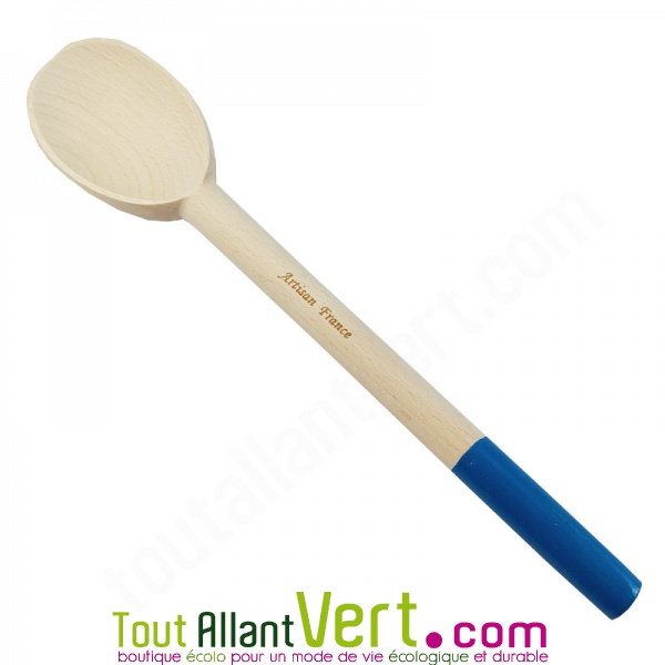 Cuillère en bois de hêtre, 30 cmCette cuillère en bois sera votre allier pour vos poêles fragiles. Son bout coloré Bleu apporte de la couleur à votre cuisine ! Cette cuillère présente de nombreux avantages écologiques. En bois de hêtre non traité, la finition à la cire d'abeille est très soignée et saine. Large, elle permet de retourner facilement vos viandes, poissons et autres légumes.
