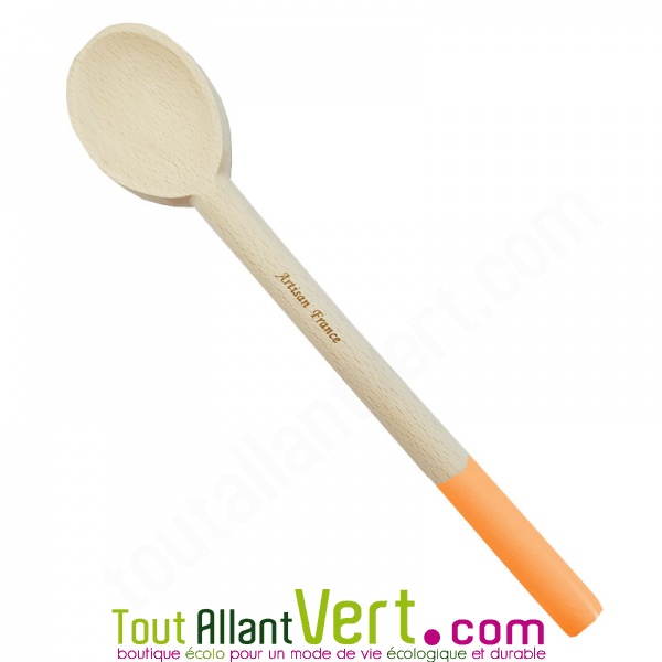 Cuillère en bois de hêtre, 30 cmCette cuillère en bois sera votre allier pour vos poêles fragiles. Son bout coloré Orange apporte de la couleur à votre cuisine ! Cette cuillère présente de nombreux avantages écologiques. En bois de hêtre non traité, la finition à la cire d'abeille est très soignée et saine. Large, elle permet de retourner facilement vos viandes, poissons et autres légumes.