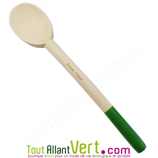 Cuillère en bois de hêtre, 30 cmCette cuillère en bois sera votre allier pour vos poêles fragiles. Son bout coloré Vert apporte de la couleur à votre cuisine ! Cette cuillère présente de nombreux avantages écologiques. En bois de hêtre non traité, la finition à la cire d'abeille est très soignée et saine. Large, elle permet de retourner facilement vos viandes, poissons et autres légumes.