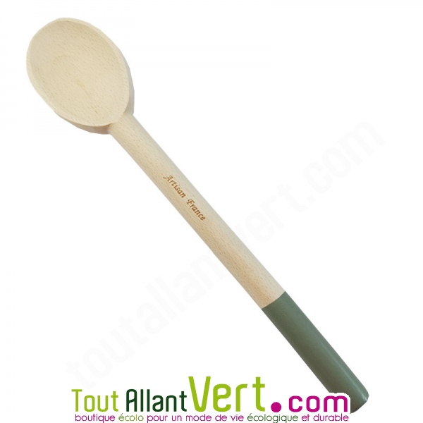Cuillère en bois de hêtre, 30 cmCette cuillère en bois sera votre allier pour vos poêles fragiles. Son bout coloré Vert Olive apporte de la couleur à votre cuisine ! Cette cuillère présente de nombreux avantages écologiques. En bois de hêtre non traité, la finition à la cire d'abeille est très soignée et saine. Large, elle permet de retourner facilement vos viandes, poissons et autres légumes.