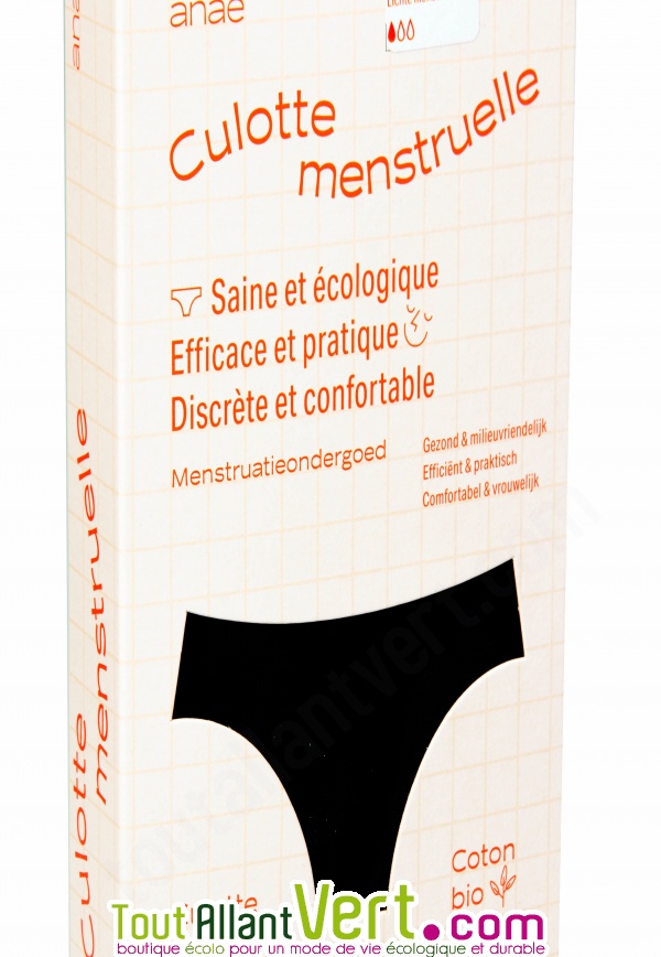 Culotte menstruelle Anaé, pour vous protéger lors de vos règles à flux abondants. Ecologique et saine, cette culotte en coton 100% bio est réutilisable. Discrète et confortable, elle garantit une protection optimale ! Fabriquée en Europe.