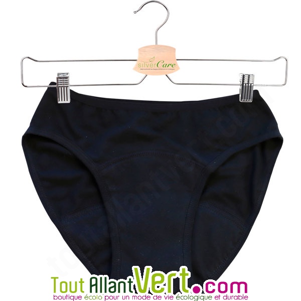 Culotte menstruelle lavable et réustilisable en coton 100% bio. Hypoallergénique. Possède un bon maintien et capacité ultra absorbante. Taille L, 44/46, Tour de taille de 102-110cm. Coloris Noir. Jusqu'à 100 lavages. Marque Silver Care.